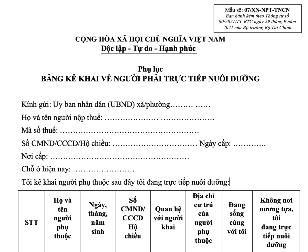 Mẫu bảng kê khai về người phải trực tiếp nuôi dưỡng khi tính thuế TNCN theo mẫu 07/XN-NPT-TNCN tại Phụ lục II ban hành kèm theo Thông tư 80/2021/TT-BTC như sau:
