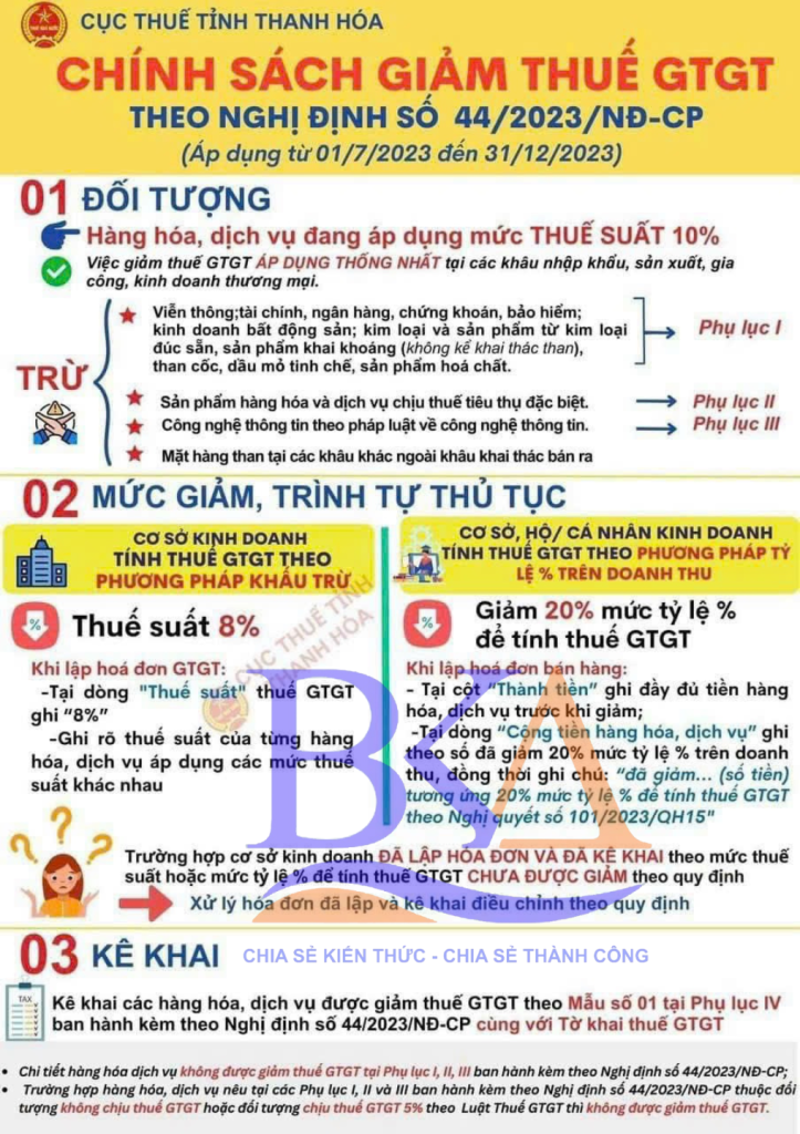 a) Cơ sở kinh doanh tính thuế giá trị gia tăng theo phương pháp khấu trừ được áp dụng mức thuế suất thuế giá trị gia tăng 8% đối với hàng hóa, dịch vụ quy định tại Khoản 1 Điều 1 Nghị định 44/2023/NĐ-CP