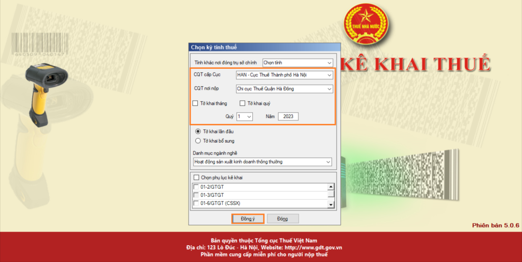 -> Chọn kỳ tính thuế: “Tháng/quý, năm” (mặc định sẽ là tháng hoặc quý hiện tại)
