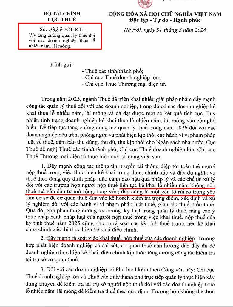 Cập nhật Công văn 1927/CT-KTr của Cục Thuế về quản lý doanh nghiệp lỗ nhiều năm, lãi mỏng. Phân tích rủi ro, tiêu chí kiểm tra và lưu ý quan trọng cho doanh nghiệp năm 2026.