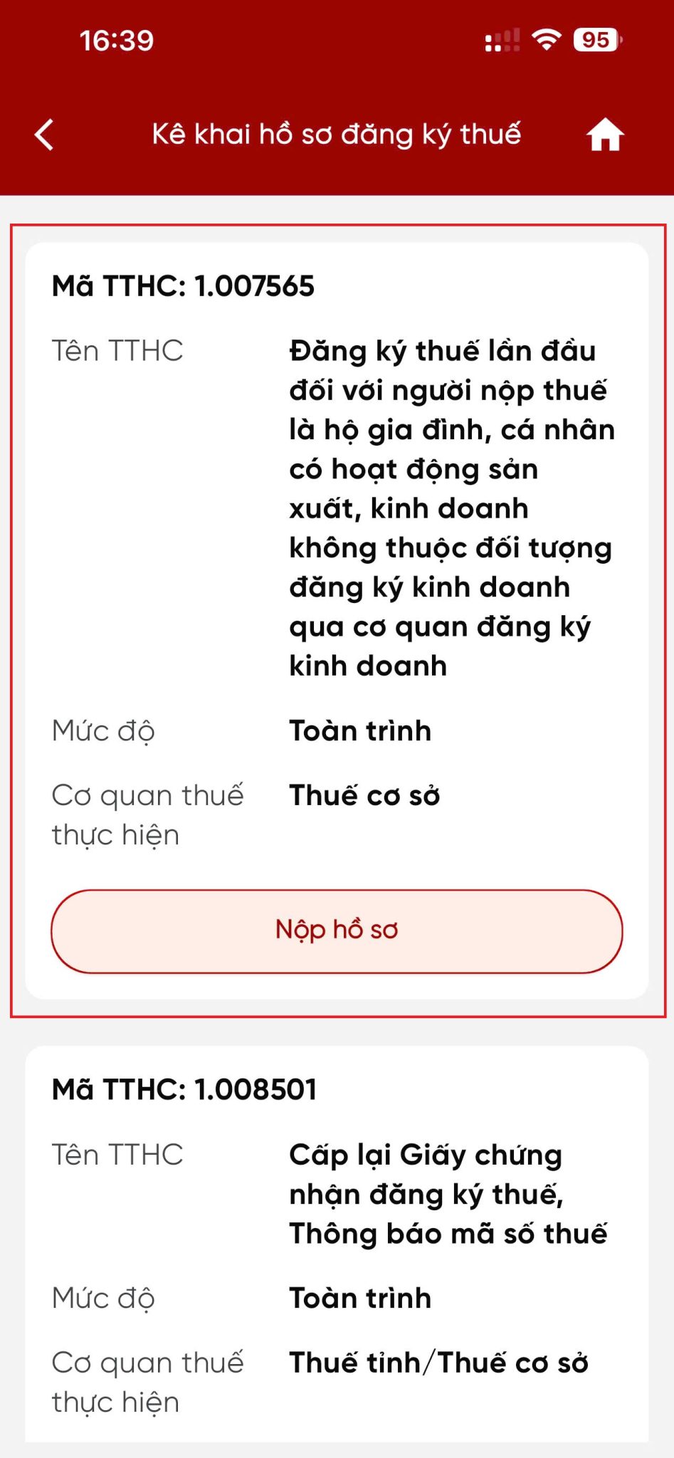1.007565 – Đăng ký thuế lần đầu cho cá nhân/hộ kinh doanh không đăng ký kinh doanh