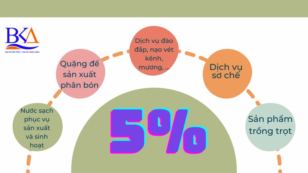 + Dịch vụ đào đắp, nạo vét kênh, mương, ao hồ phục vụ sản xuất nông nghiệp; nuôi trồng, chăm sóc, phòng trừ sâu bệnh cho cây trồng; sơ chế, bảo quản sản phẩm nông nghiệp (trừ nạo, vét kênh mương nội đồng thuộc trường hợp không chịu thuế).