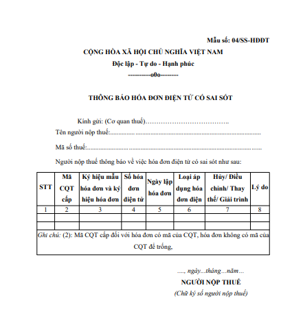 Mẫu 04/SS-HĐĐT là mẫu thông báo hóa đơn điện tử có sai sót gửi cơ quan thuế để Cơ quan thuế thực hiện hủy hóa đơn điện tử đã được cấp mã có sai sót lưu trên hệ thống của cơ quan thuế.