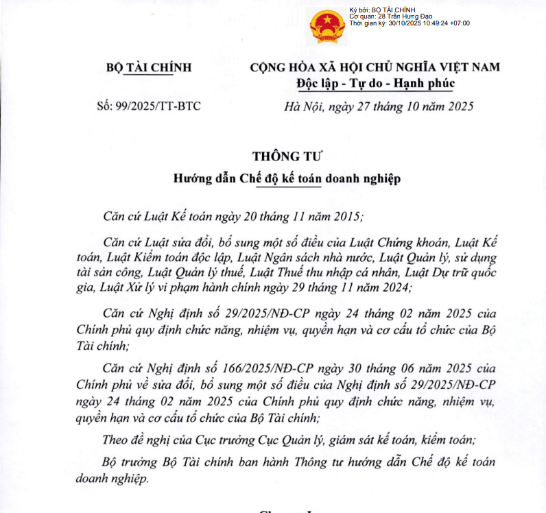 Ngày 27/10/2025, Bộ Tài chính chính thức ban hành Thông tư 99/2025/TT-BTC hướng dẫn Chế độ kế toán doanh nghiệp, thay thế cho các văn bản cũ gồm: